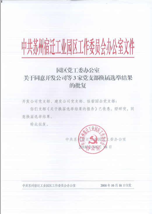 園區(qū)黨工委辦公室 關于同意開發(fā)公司等3家黨支部換屆選舉結果的批復