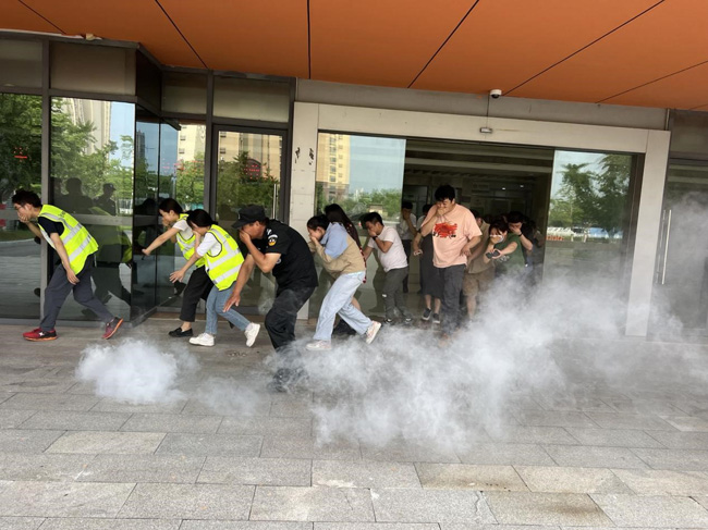 隨著警報聲拉響,模擬演練生產(chǎn)力中心出現(xiàn)火情,現(xiàn)場巡查員發(fā)現(xiàn)火情后立即上報,啟動消防應(yīng)急預(yù)案,指揮組、滅火組、疏散組、救護(hù)組、警戒組、保障組等成員按照分工,有條不紊地組織義務(wù)消防隊員開展撲救火災(zāi)、現(xiàn)場救護(hù)傷員、疏散樓內(nèi)職工、現(xiàn)場警戒等工作。